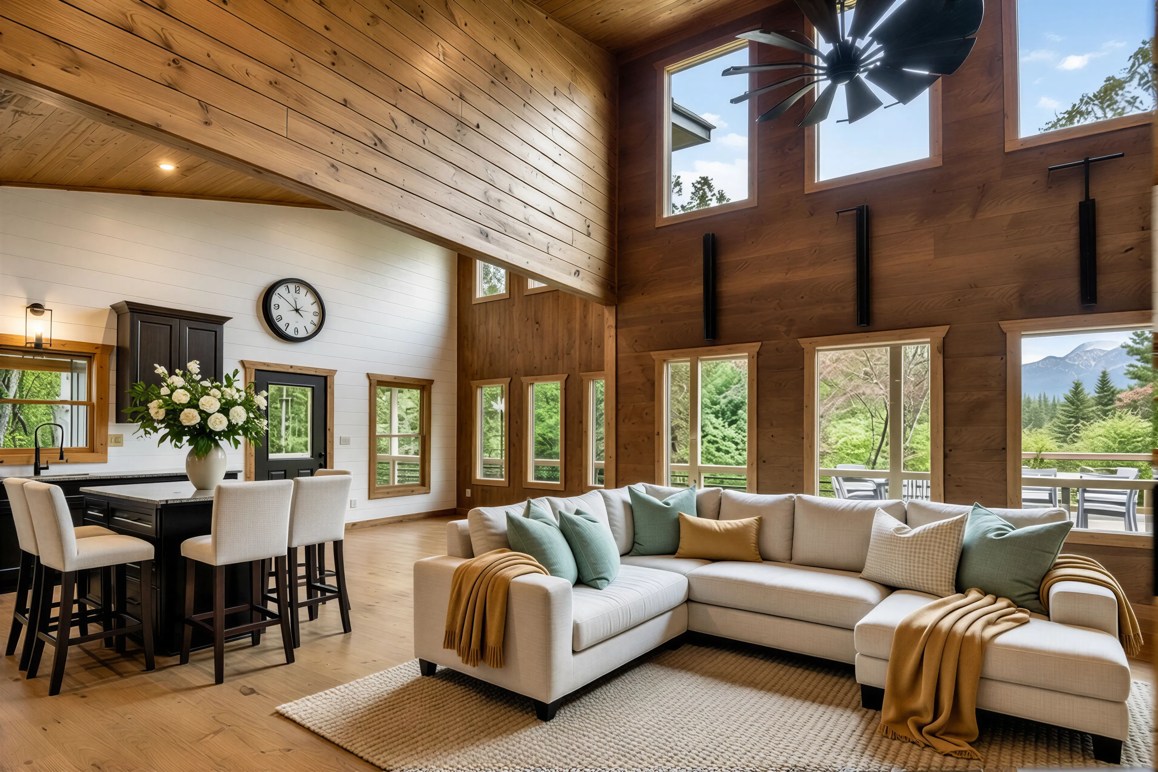 An intentional transformation of a monumental open-concept space into curated living zones. By integrating a custom breakfast nook and a sophisticated palette of cream, slate, and muted mint, this design elevates the home's natural wood and custom millwork. The result is a seamless blend of grand scale and intimate luxury, tailored for the mountain-modern market.