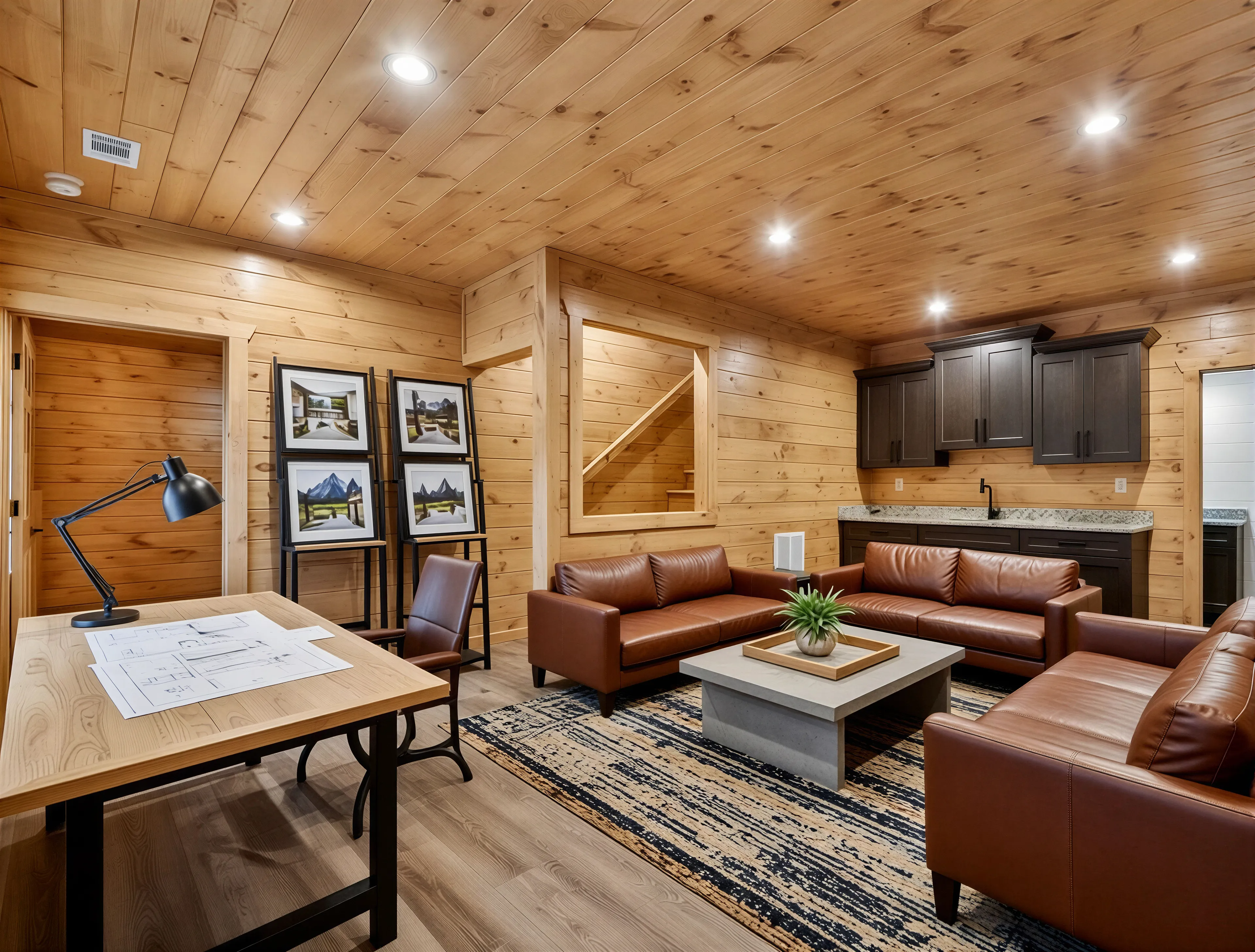 Reimagining the terrace level as a high-functioning executive design studio. This layout leverages the existing custom cabinetry and open architecture to create a professional workspace, blending technical drafting zones with a refined lounge for client collaboration.