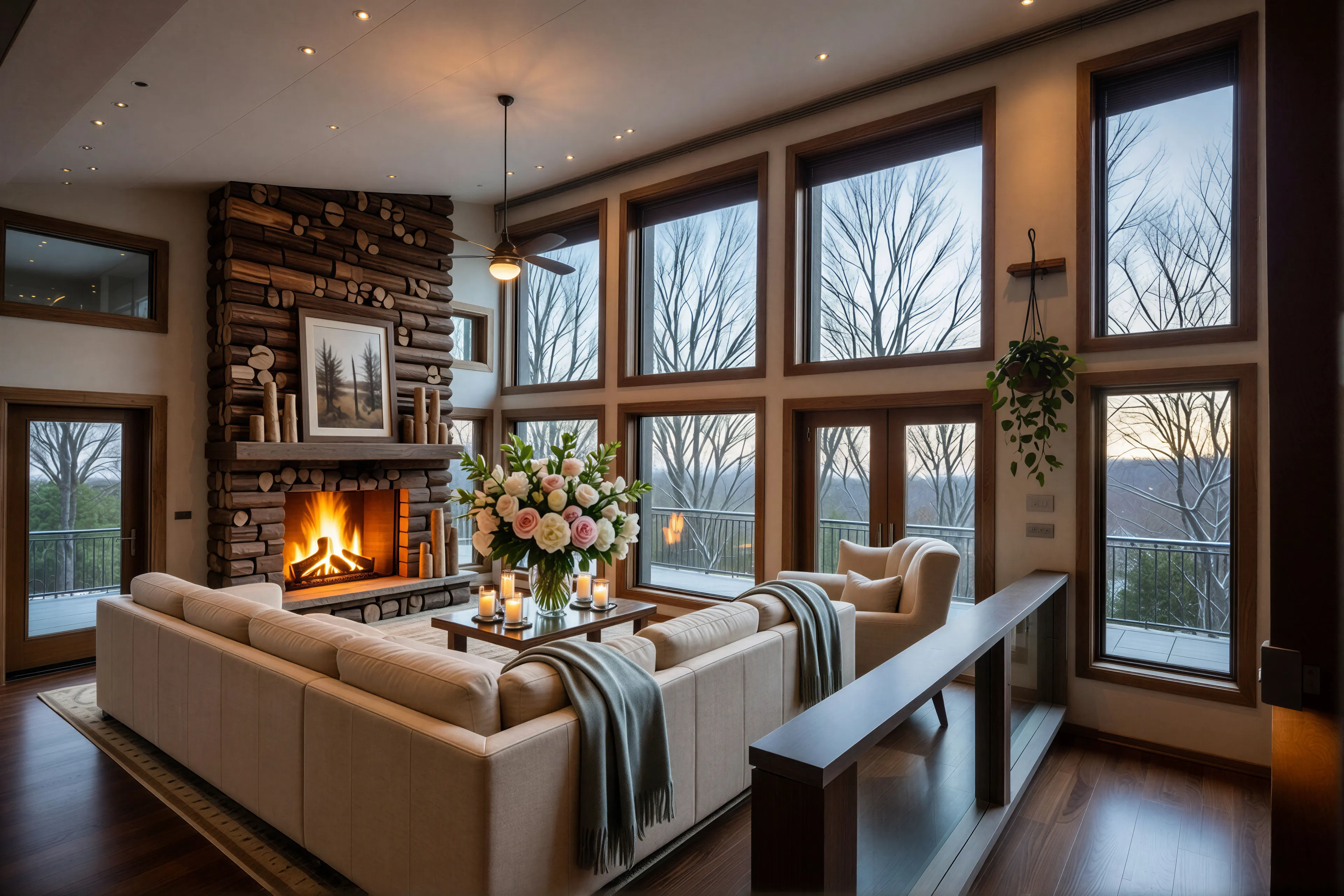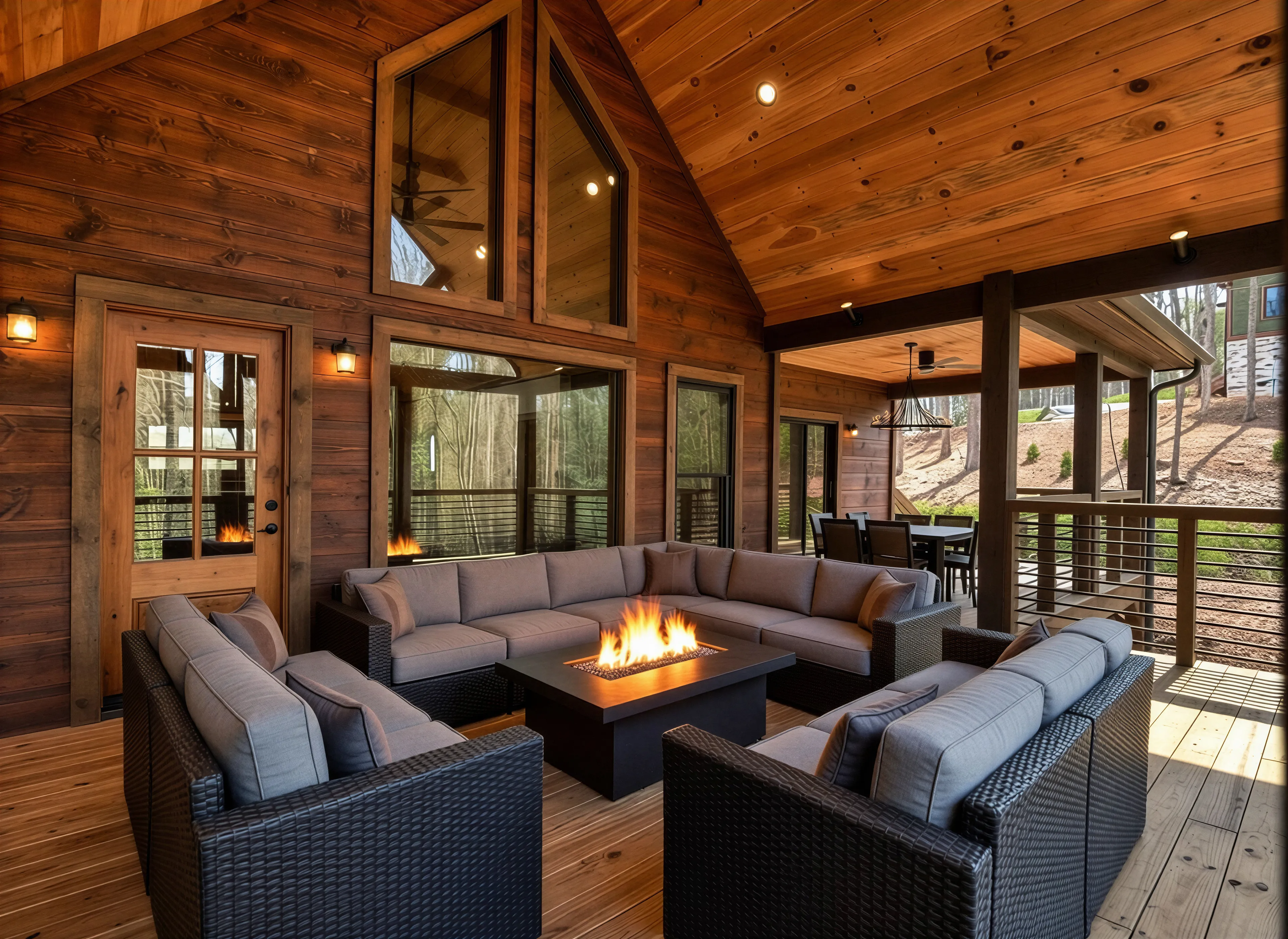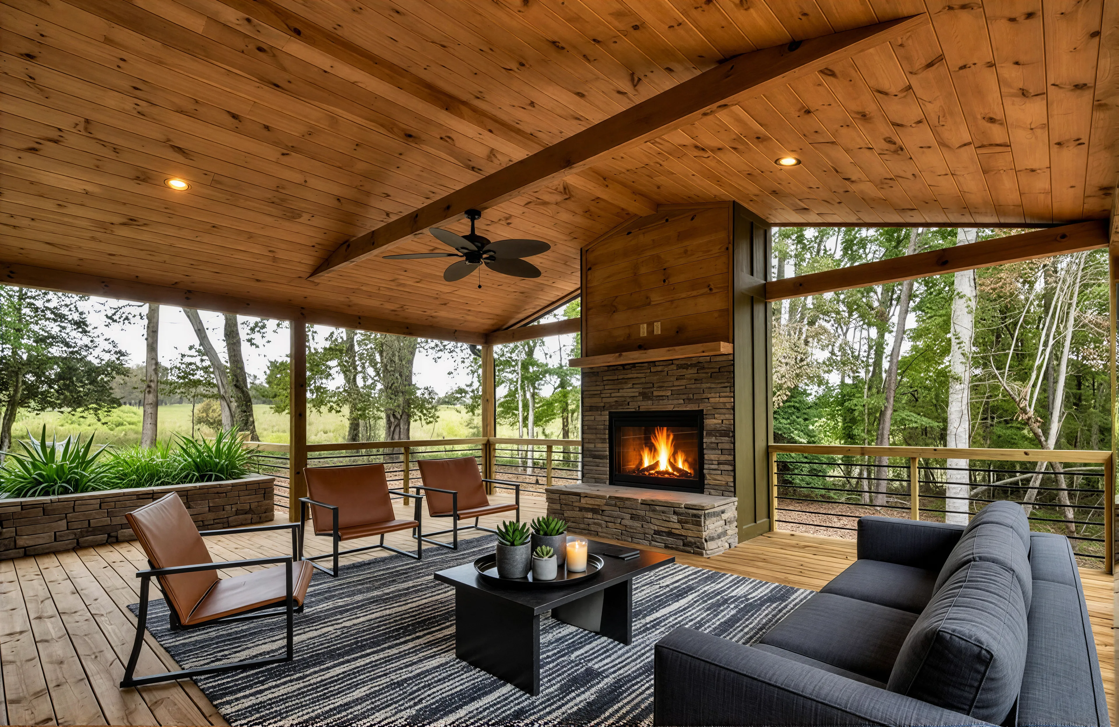 Strategic staging of a monumental deck, emphasizing the custom stone fireplace and scale. Using a palette of slate, saddle leather, and charcoal, this design frames the mountain views with minimalist, low-profile furniture and native ferns to create a seamless indoor-outdoor sanctuary.