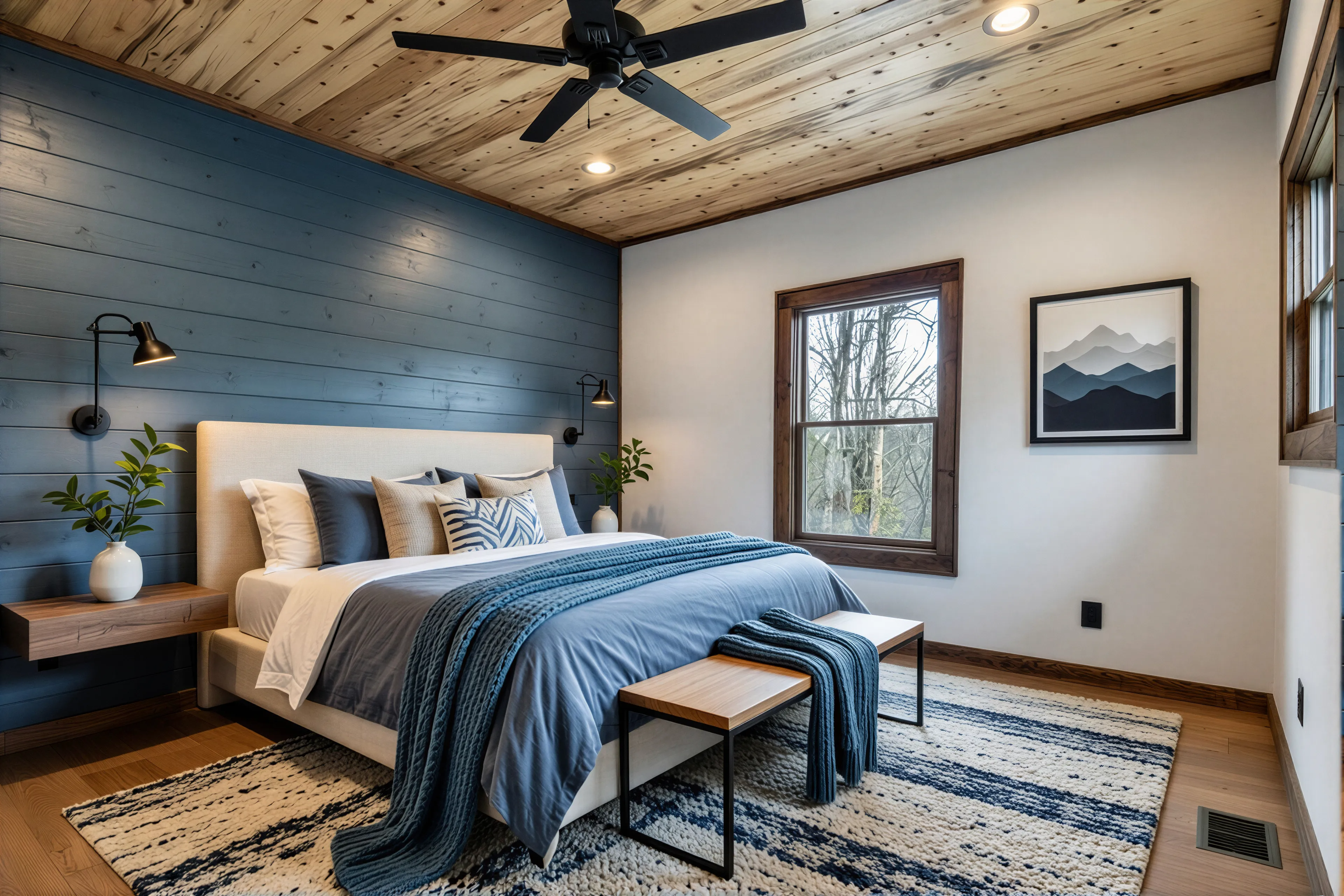 A serene visualization designed to showcase 'One-Level Living' comfort. Featuring a soft blue and cream textile palette with a minimalist bed bench, this stage highlights the room’s expansive wood textures while creating a warm, approachable atmosphere.